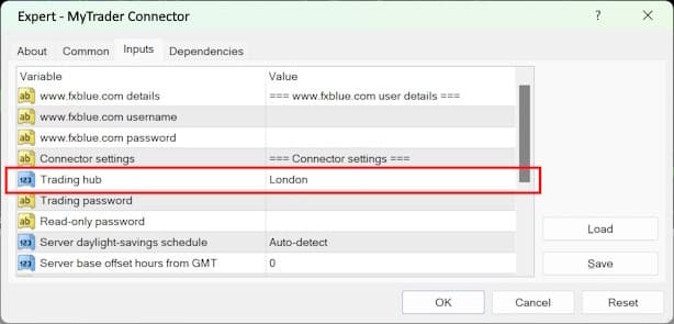 On the Inputs tab of the settings window, you need to choose which MyTrader hub to connect to. You simply pick the hub nearest to you. You need to make the same choice when logging into the MyTrader web/mobile platform.